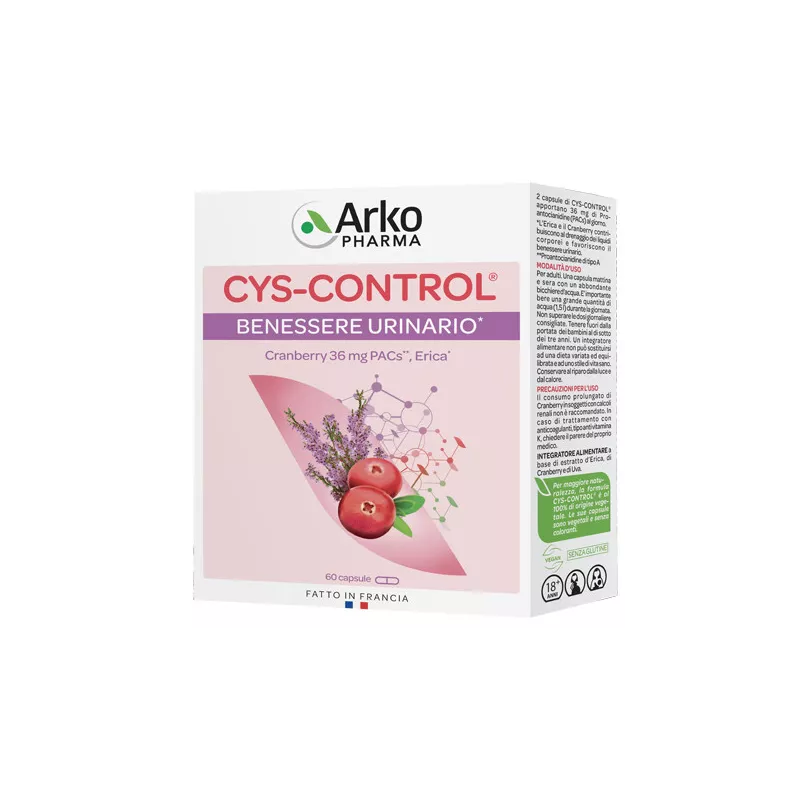 Ingredienti Estratto di bacca di cranberry (Vaccinium macrocarpon Ait.), estratto di sommità fiorita di erica [Calluna vulgaris (L.) Hull], fibre di mela (Malus domestica Borkh.), polvere di frutto di grano saraceno (Fagopyrum esculentum Moench.); antiagglomeranti: stearato di magnesio, mono e digliceridi degli acidi grassi.