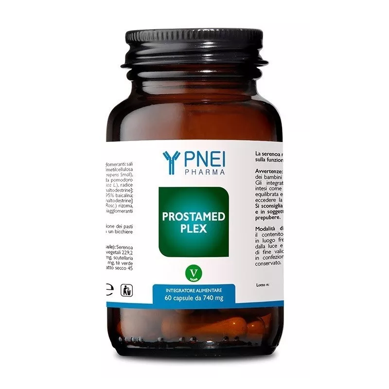 Ingredienti Amido; agente di carica: carbonato di calcio; agenti antiagglomeranti: sali di magnesio degli acidi grassi, biossido di silicio; capsula idrossipropilmetilcellulosa (HPMC), Serenoa [Serenoa repens (W. Bartram Small)] estratto secco tit. 45% acidi grassi tot., steroli vegetali (15,6%) frutti, licopene da pomodoro (Solanum lycopersicum L.) frutto, ortica (Urtica dioica L.), radice estratto secco tit. 0,4% steroli tot. espressi come beta-sitosteroli, Scutellaria (Scutellaria balcalensis Georgl.), radice estratto secco tit. 95% baicalina, quercetina, tè verde [Camellia sinensis (L.) Kuntze] foglie, estratto secco tit. 95% polifenoli totali, al 75% in catechine totali e 45% in epigallocatechina-3-gallato, zenzero (Zingiber officinalis Rosc.) rizoma estratto secco tit. 5% gingeroli.