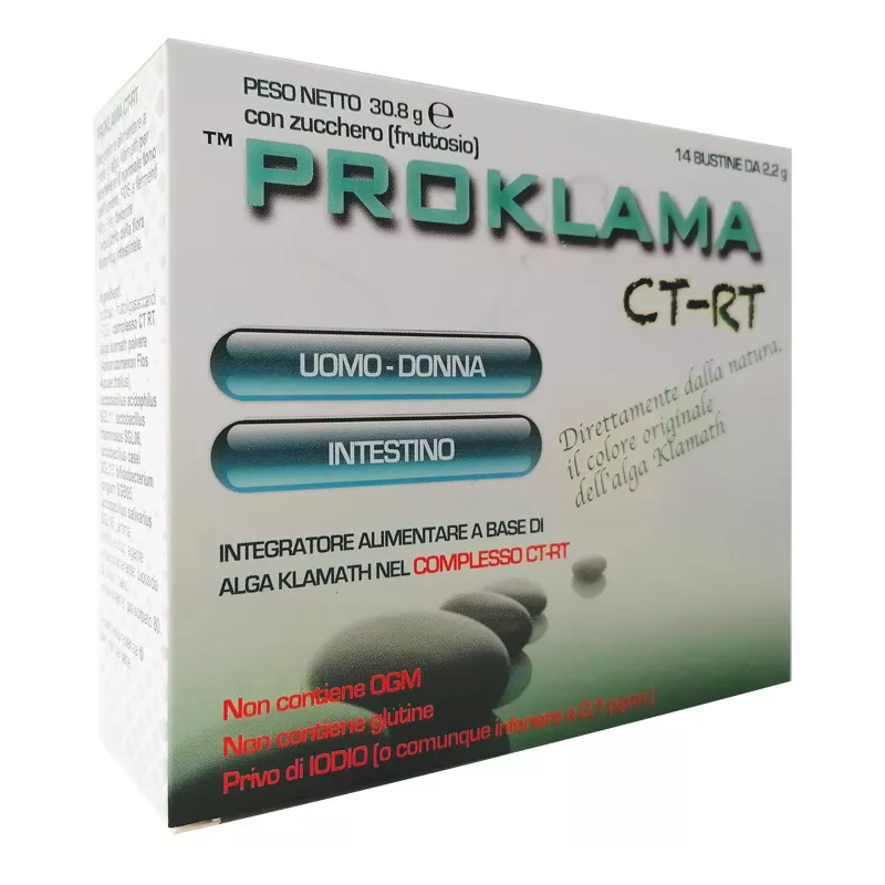 Modalità d'uso Normalmente al mattino, prima di colazione, sciogliere il contenuto di una bustina di Proklama CT-RT in un abbondante bicchiere d'acqua, mediante agitazione e bere la soluzione ottenuta. Si potrà apprezzare il colore caratteristico dell'alga Klamath con le sue integre proprietà.