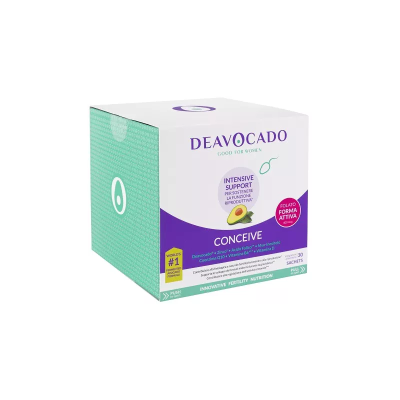 Ingredienti Maltodestrine, deavocado 100% italiano (Persea americana Mill. frutto, fermentato) polvere, myo-inositolo, aroma; correttore di acidità: acido citrico; agente antiagglomerante: biossido di silicio; coenzima Q10, vitamina D3 (colecalciferolo), vitamina B12 (cianocobalamina); emulsionante: monoleato di poliossietilensorbitano, gluconato di zinco; edulcorante: sucralosio; vitamina B6 (cloridrato di piridossina), acido folico [acido (6S)-5- metiltetraidrofolico, sale della glucosamina].