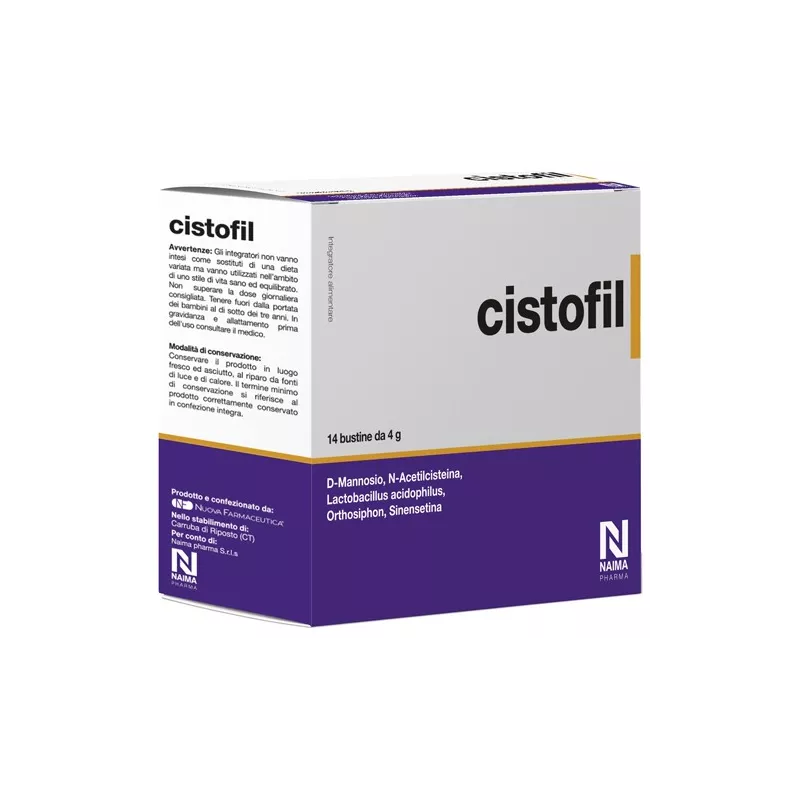 Descrizione Nutraceutico contenente D-mannosio che riduce l'adesività batterica, venendo così utilizzato per combattere la fase acute della cistite, nel trattamento della batteriuria asintomatica e nella prevenzione della cistite batterica e post coitale. Il lactobacillus acidophilus produce due potenti antibiotici naturali efficaci per eliminare parecchi batteri patogeni, tra i quali escerichia coli, maggiormente coinvolto nelle cistiti, la sinensetina invece funge da diuretico alleviando così i dolori e i fastidi durante la minzione causate dall'infezione. La NAC contenuta in Cistofil invece, disgrega il biofilm batterico eliminandone o riducendone la cronicità.