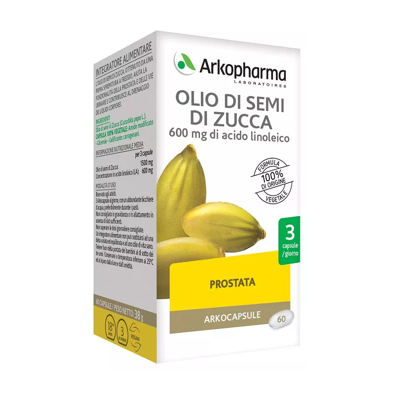Olio di semi di zucca Concentrazione in acido linoleico (LA) | 1.500 mg 600 mg |