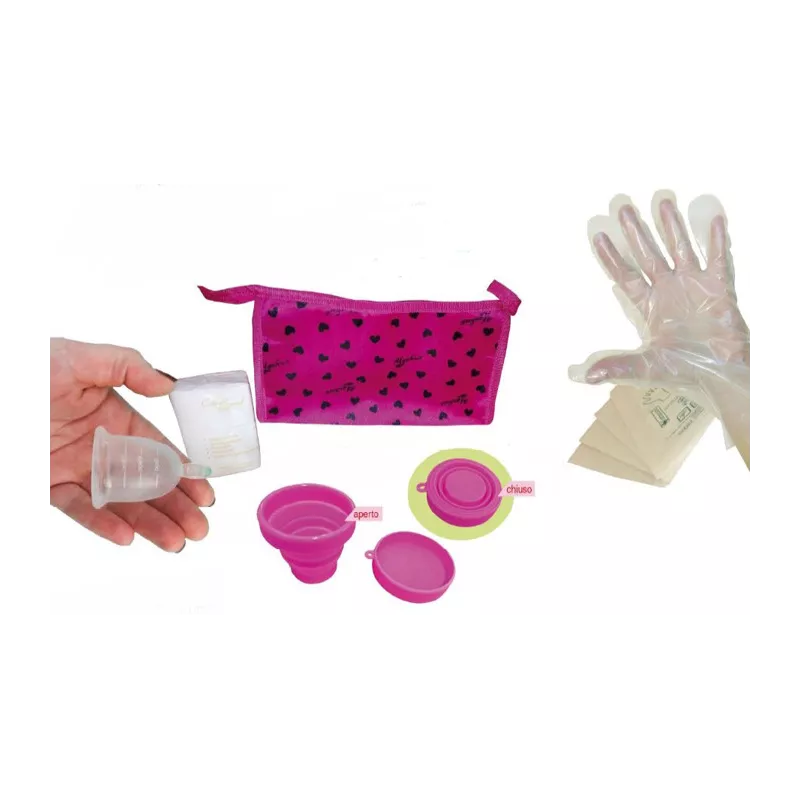 Questo kit contiene tutto ciò che può servire per gestire al meglio la propria coppetta mestruale. La pratica e discreta pochette contiene il necessario per inserire, svuotare, conservare, trasportare ed igienizzare la coppetta quando si è in viaggio o fuori dalla propria abitazione per qualsiasi motivo, così come in casa. Il kit contiene una coppetta mestruale FarmaCup (piccola o grande); guanti singoli speciali monouso non sterili ad alta sensibilità, elasticità e resistenza, confezionati singolarmente su un supporto (foglio) di carta mediciale utilizzabile per il successivo smaltimento; un CleanerCup in silicone per sterilizzazione della coppetta (capacità 170 ml, pieghevole e chiudibile con coperchio); un pacchetto di salviette monouso in cotone; una pochette con zip di chiusura.