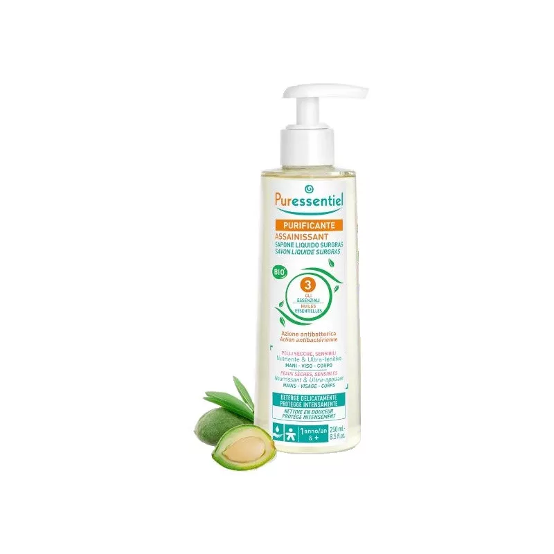 Il Sapone Surgras Liquido Puressentiel deterge delicatamente e protegge intensamente la pelle da impurità e germi. Da utilizzare quotidianamente sul viso e sul corpo, e per lavare frequentemente le mani. Ripristina il film idrolipidico e lenisce le sensazioni di tensione della pelle. È adatto alle pelli secche e sensibili, grazie al suo effetto nutriente e ultra-lenitivo. Questo sapone lascia la pelle sana e delicatamente profumata e rispetta l'equilibrio fisiologico della pelle. Formula al 98,4% di origine naturale con oli essenziali biologici di limone, lavanda e tea tree.