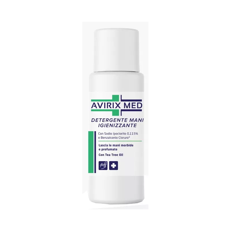 Avirix Med è un detergente cosmetico per le mani che pulisce, igienizza ed aiuta a preservare lo stato di pulizia delle mani. Con sodio ipoclorito 0,115% e benzalconio cloruro (preservante). Con tea tree oil.