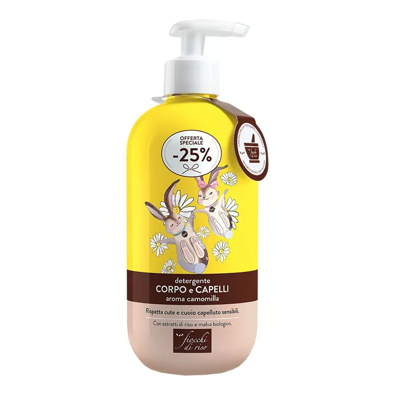 Detergente corpo e capelli all'aroma di Camomilla con estratti di riso e Malva biologico e che rispetta cute e cuoio capelluto sensibili.