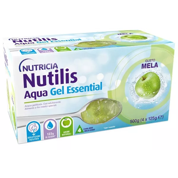 Descrizione Alimento a fini medici speciali. Contiene edulcorante. Indicato per la gestione dietetica della malnutrizione associata a patologia in caso di disfagia. Nutilis Aqua Gel Essential è un alimento a fini medici speciali ad elevato contenuto di acqua (98%) la cui consistenza è stata modi cata con l'aggiunta di speci ci addensanti per renderlo idoneo all'idratazione di pazienti con problemi di deglutizione (disfagia).