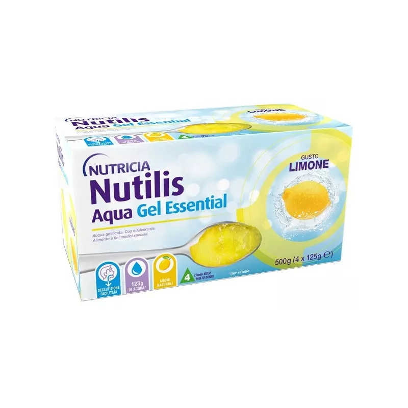 Descrizione Alimento a fini medici speciali. Contiene edulcorante. Indicato per la gestione dietetica della malnutrizione associata a patologia in caso di disfagia. Nutilis Aqua Gel Essential è un alimento a fini medici speciali ad elevato contenuto di acqua (98%) la cui consistenza è stata modi cata con l'aggiunta di speci ci addensanti per renderlo idoneo all'idratazione di pazienti con problemi di deglutizione (disfagia).