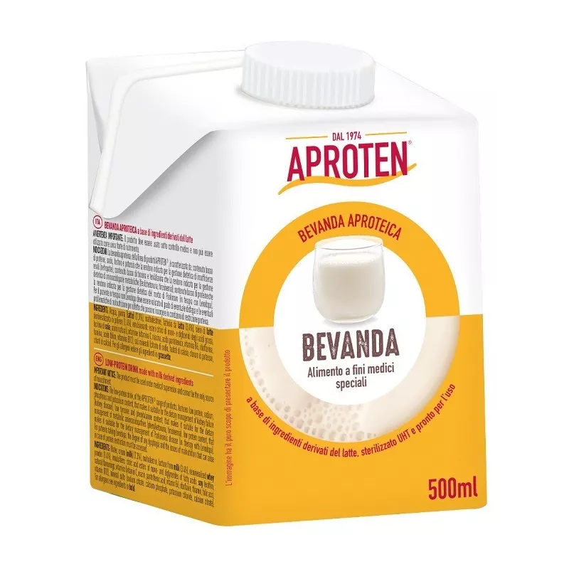 Descrizione La bevanda aproteica, della linea di prodotti APROTEN, è caratterizzata da: contenuto basso di proteine, sodio, fosforo e potassio che la rendono indicata per la gestione dietetica di insufficienze renali (nefropatie); contenuto basso di tirosina e fenilalanina che la rendono indicata per la gestione dietetica di aminoacidopatie metaboliche (fenilchetonuria, tirosinemia); contenuto basso di proteine che la rendono indicata per la gestione dietetica del morbo di Parkinson (in terapia con Levodopa). Per il paziente in terapia con Levodopa deve essere valutato il grado di eventuale disfagia e le eventuali problematiche di malnutrizione per difetto che possono insorgere in condizioni di restrizione proteica.