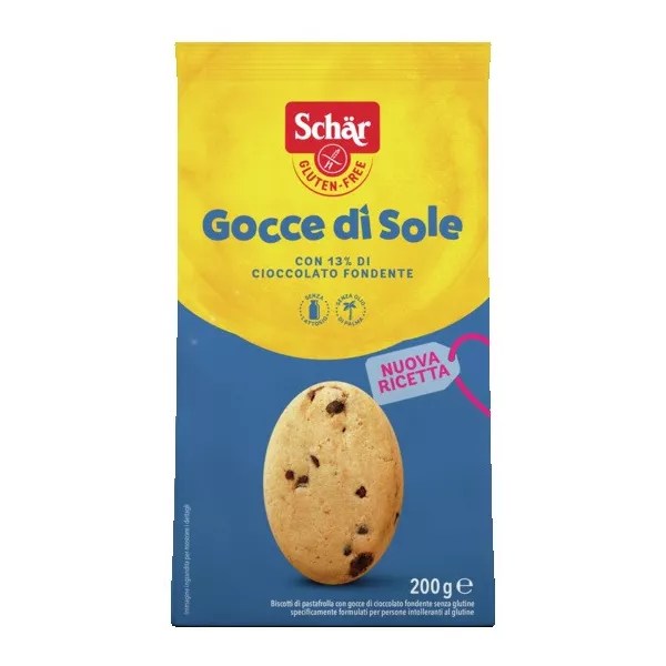 Descrizione Biscotti di pasta frolla con gocce di cioccolato fondente senza glutine.