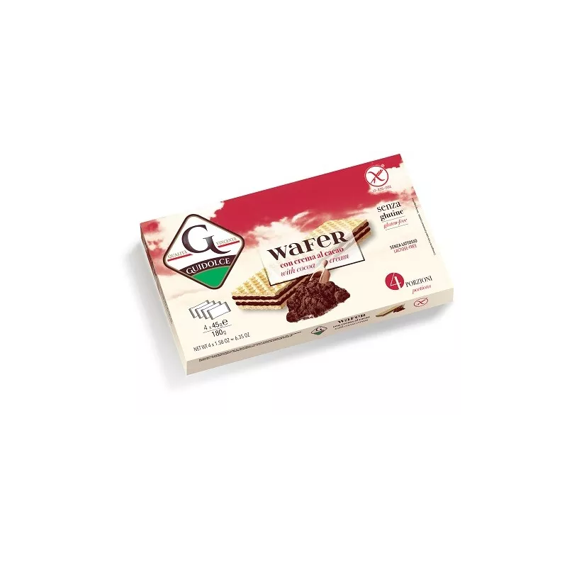 Descrizione Wafers farciti con crema al cacao (crema 75%) senza glutine. Il prodotto è formulato specificatamente per consumatori celiaci ed è privo di lattosio; non ci sono comunque prescrizioni al consumo da parte del consumatore non sensibile. 3 cialde di wafer con 2 strati di farcitura al cacao.