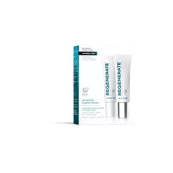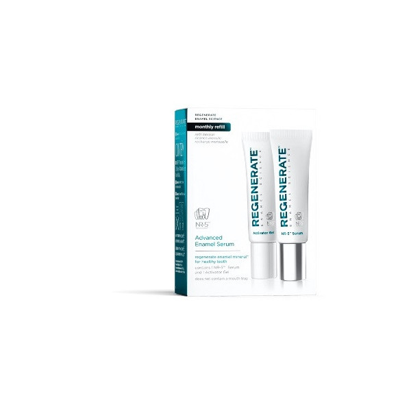 L’80% dei comuni problemi dentali, come sensibilità, ingiallimento, trasparenza e fragilità sono causati dall’erosione dello smalto e dall’attacco degli acidi. Regenerate Enamel Science è il primo Sistema di igiene orale in grado di rigenerare lo smalto dentale*, invertendo il processo di erosione, donando denti più sani e forti. Gli ingredienti della sua esclusiva formula NR-5 si combinano per formare un nuovo apporto di minerali dello smalto che avvolgono i denti e si integrano sulla loro superficie. La ricarica del Siero Avanzato va utilizzata con le mascherine originali fornite con il kit del Siero Avanzato. Sostituire periodicamente le mascherine.