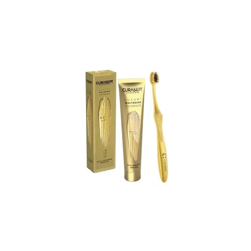 Pasta dentifricia sbiancante con microperle oro e argento, perossido di carbamide, peroxydone e idrossiapatite sostituita e coniugata con chitosano.
