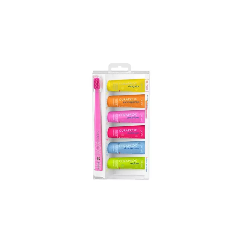 Pack che contiene i 6 gusti di dentifricio della linea BE YOU con uno spazzolino.