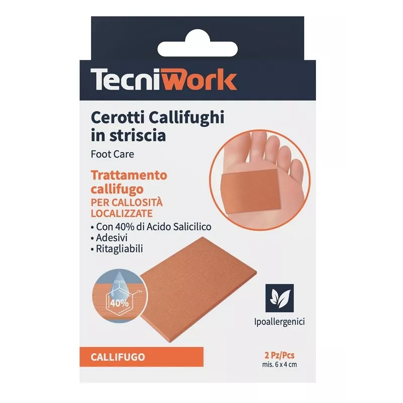 Cerotti callifughi in striscia ritagliabili e adesivi, eliminano rapidamente le callosità localizzate sui piedi. Ipoallergenici con il 40% di Acido Salicilico, per eliminare velocemente ogni tipo di callo.