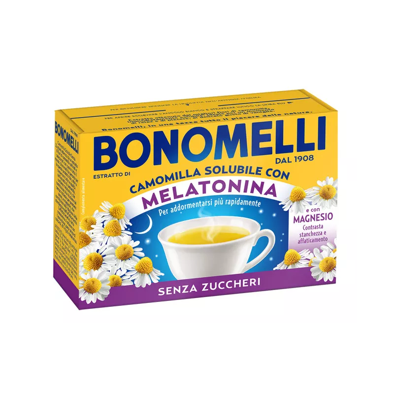 Preparato solubile per bevanda a base di estratto di camomilla, melatonina e magnesio, aromatizzata alla vaniglia.