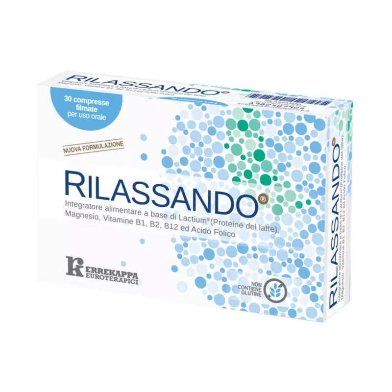 RILASSANDO® è un integratore alimentare a base di Lactium, magnesio, Vitamine del gruppo B ed Acido Folico. RILASSANDO® e` consigliato in tutti i casi di: stati d’ansia, insonnia, nervosismo, alterazione del tono dell’umore, affaticamento, cefalea, stress.