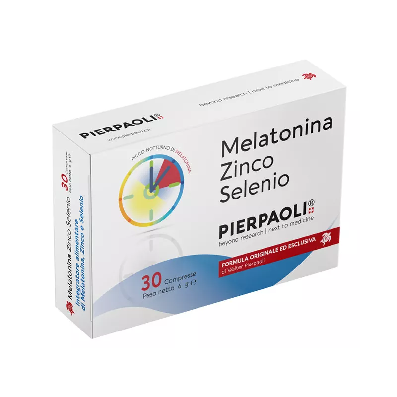 Descrizione Melatonina Pierpaoli contribuisce alla riduzione del tempo richiesto per prendere sonno; l'effetto benefico si ottiene assumendo 1 mg di Melatonina poco prima di andare a dormire. La Melatonina contribuisce ad alleviare gli effetti del jet lag. Lo Zinco contribuisce alla normale funzione del sistema immunitario e alla protezione delle cellule dallo stress ossidativo. Il Selenio contribuisce alla protezione delle cellule dallo stress ossidativo e alla normale funzione tiroidea. Formula originale nata dalle osservazioni scientifiche maturate nel corso di cinquant'anni di ricerca e studi clinici condotti dal Prof. Walter Pierpaoli e dai suoi collaboratori, sulla Melatonina e sulla ghiandola Pineale, e sul loro stretto rapporto con i meccanismi dell'invecchiamento. La Melatonina Zinco Selenio Pierpaoli è stata sviluppata con l'intento di ottenere un picco di rilascio di Melatonina durante la notte ed è stata formulata per soddisfare il fabbisogno delle funzioni fisiologiche dell'organismo.