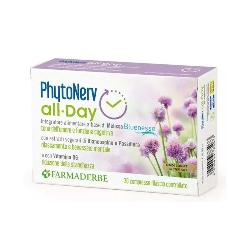 Ingredienti Agenti di carica: idrossipropilmetilcellulosa, cellulosa microcristallina; Blueness - melissa foglie e.s. (Melissa officinalis L.) tit. 6% ac. rosmarinico, biancospino fiori e foglie e.s. (Crataegus curvisepala Lindm.) tit. 1% flavonoidi, passiflora erba con fiori e.s. (Passiflora incarnata L.) tit. 3,5% vitexina, polivinilpirrolidone, camomilla capolini e.s. (Matricaria chamomilla L.) tit. 0,3% apigenina; agenti antiagglomeranti: sali di magnesio degli acidi grasso, biossido di silicio; vitamina B6 (piridossina cloridrato).