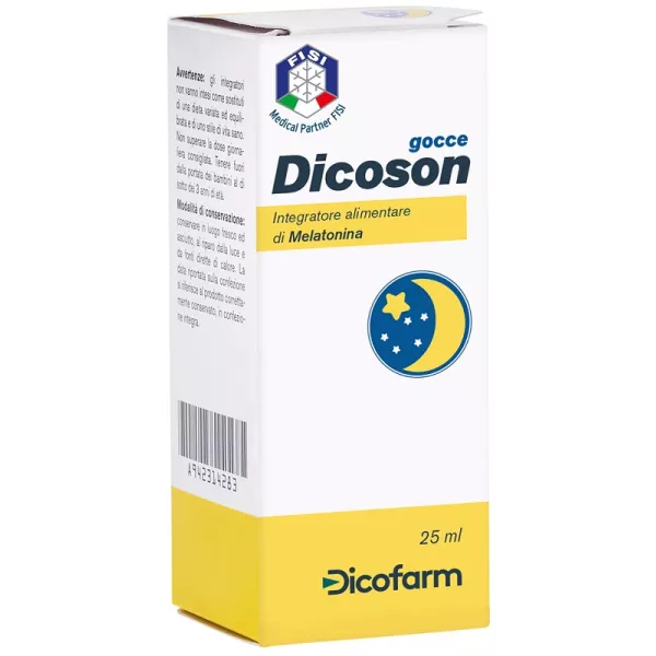 Descrizione Integratore alimentare a base di melatonina. La melatonina contribuisce alla riduzione del tempo richiesto per prendere sonno. L'effetto benefico si ottiene con l'assunzione, poco prima di coricarsi, di 1 mg di melatonina (pari a 5 gocce di Dicoson gocce). La melatonina contribuisce anche ad alleviare gli effetti del fuso orario. L'effetto benefico è ottenuto con l'assunzione minima di 0,5 mg poco prima di coricarsi, dal primo giorno di viaggio e nei pochi giorni successivi all'arrivo a destinazione.