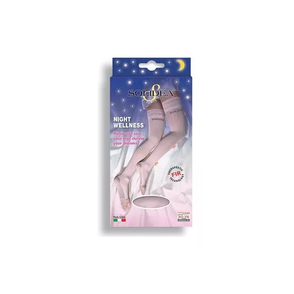 Calze a compressione graduata 12/15 mmHg, a raggi infrarossi, studiate appositamente per essere indossate durante il sonno notturno. Dotate di balza autoreggente con elastomero al silicone di nuova generazione, molto più tollerabile del silicone tradizionale. La compressione graduata potenzia la fisiologica riduzione della circonferenza delle gambe durante il sonno. Realizzato con filato contenente un additivo minerale che, stimolato dall'energia termica naturale del corpo, la converte in raggi infrarossi FIR e la rimanda al tessuto cutaneo, con gradevole effetto termoregolatore. Questa azione, insieme alla compressione graduata, aiuta a tonificare la pelle e a mantenerla liscia e vellutata. Arricchito con funzione igienica Sanitized. Indossare costantemente queste calze dal piacevole aspetto, permette di alzarsi al mattino in ottima forma e con gambe più snelle.