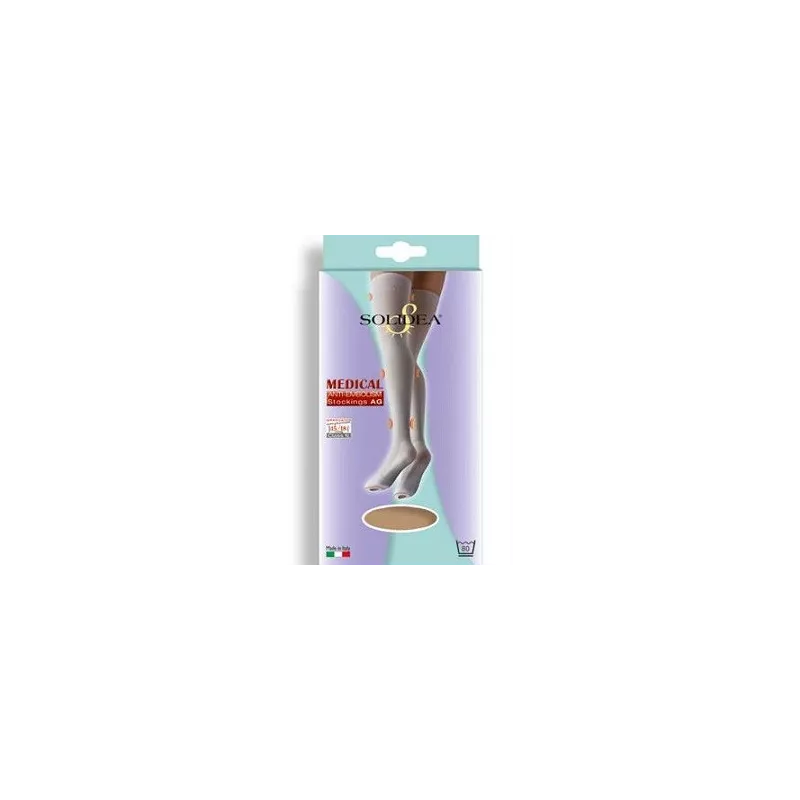 Calze elastiche antitrombo all’inguine (AG) a compressione 15/18 mmHg per la prevenzione della trombosi venosa profonda (TVP) e dell’embolia polmonare (EP). Sono dotate di un particolare bordo con elastico al silicone autoreggente e anallergico, particolarmente indicato per i soggetti che manifestano allergie. Morbide e confortevoli grazie allo speciale tessuto a maglia tridimensionale, facili da indossare. Consigliate nei casi di degenza ospedaliera, prima, durante e dopo gli interventi chirurgici. Queste calze mantengono le loro caratteristiche se sottoposte a lavaggi fino a 80°. Con plantare massaggiante e punta ispettiva. Con funzione igienica Sanitized.