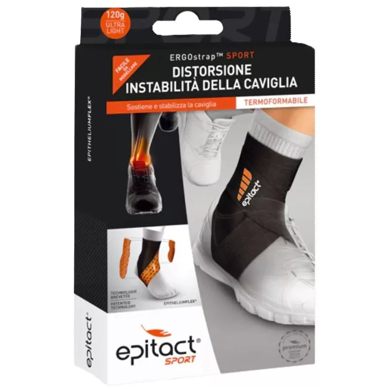 ERGOstrapTM SPORT sostiene e stabilizza la caviglia senza ostacolare il movimento grazie all'azione combinata dei rinforzi termoformabili all'altezza del malleolo e del bendaggio elastico brevettato EPITHELIUMFLEX.