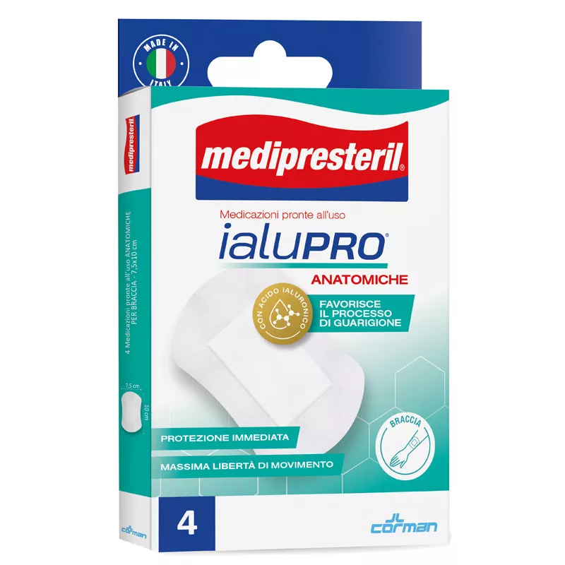 Confezione contenente 4 medicazioni pronte all’uso anatomiche per braccia misura 7,5x10 cm.