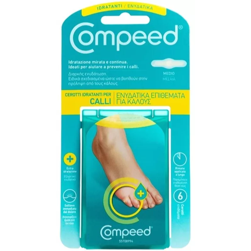 Cerotto ideato per aiutare a prevenire i calli grazie alla sua imbottitura e alla continua idratazione. La tecnologia dell'Idrocolloide Compeed per la prima volta associata al siero idratante inserito nel cuore del prodotto per rilasciare un'idratazione prolungata e mirata agli strati di pelle indurita, proteggere contro lo sfregamento e la pressione e donare sollievo dal dolore della pressione e della pelle indurita che forma il callo.