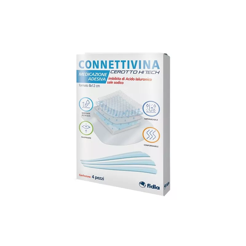 Connettivina cerotto Hi Tech è in grado di creare un ambiente umido nel sito di applicazione, protetto verso l'esterno, tale da favorire il naturale processo di riparazione tessutale in caso di escoriazioni, abrasioni, piccoli tagli, ferite superficiali, scottature.