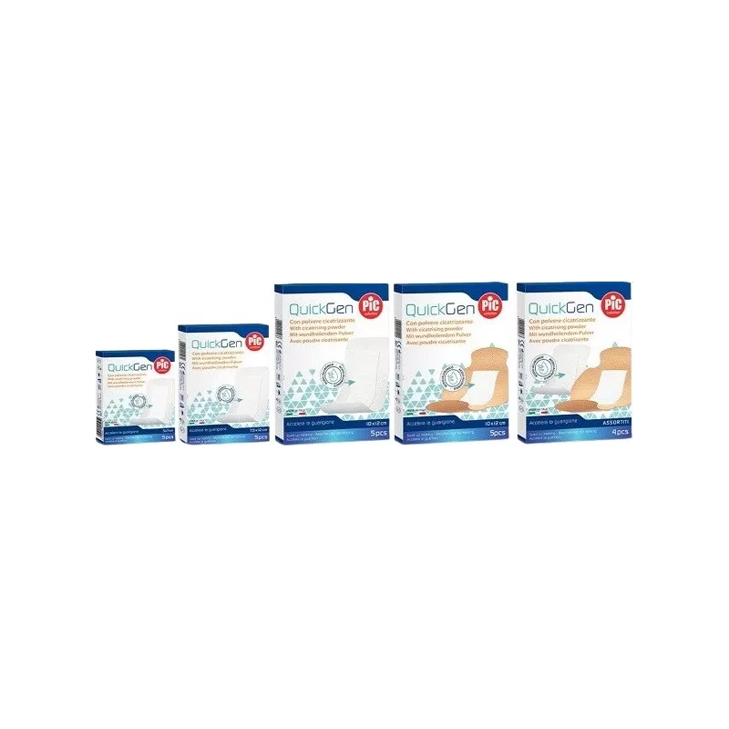È un cerotto Pic con acido ialuronico che aiuta la cute a rigenerarsi velocemente e quindi a cicatrizzare prima. Protegge la ferita e ne accelera il processo di guarigione grazie all'acido ialuronico contenuto nel tampone. QuickGen è consigliato in caso di escoriazioni, abrasioni e scottature con essudato. L'azione dell'acido ialuronico crea un film protettivo stabile sopra alla ferita che rimane cosi, sempre protetta e ben idratata: queste tre caratteristiche permettono alla pelle di rigenerarsi prima, e alla ferita di guarire velocemente. Il supporto adesivo in tessuto-non tessuto permette alla pelle di respirare, inoltre il formato "a farfalla" per articolazioni consente a gomiti e ginocchia elevata mobilità - grazie al supporto elastico e ai bordi ergonomici. QuickGen è presente in 4 referenze con dimensioni e forme diverse (tra cui la pratica shape a farfalla per articolazioni), piu una versione mix con una referenza per tipo: così puoi prenderti cura di ogni ferita nel modo più adatto.