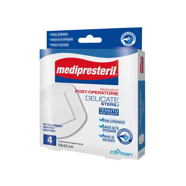 Medicazioni post-operatorie delicate sterili in tessuto non tessuto per l'assorbimento degli essudati. Ipoallergenico, garza alto spessore, privo di solventi, dermatologicamente testato.