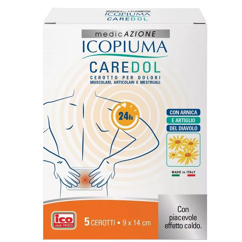 Dispositivo medico formulato e progettato per beneficiare dei suoi componenti naturali, quali arnica, artiglio del diavolo e salice, che svolgono un'azione protettiva delle aree del corpo affette da dolori muscolari, articolari, contratture di varia natura (dolori reumatici, traumi sportivi, torcicollo e lombalgie) e dolori mestruali. Inoltre, la presenza di vanillyl butyl ether dona una piacevole sensazione di calore. La speciale tecnologia garantisce l'azione di Caredol per 24 ore, mentre la durata dell'effetto caldo tende ad esaurirsi nell'arco di alcune ore.