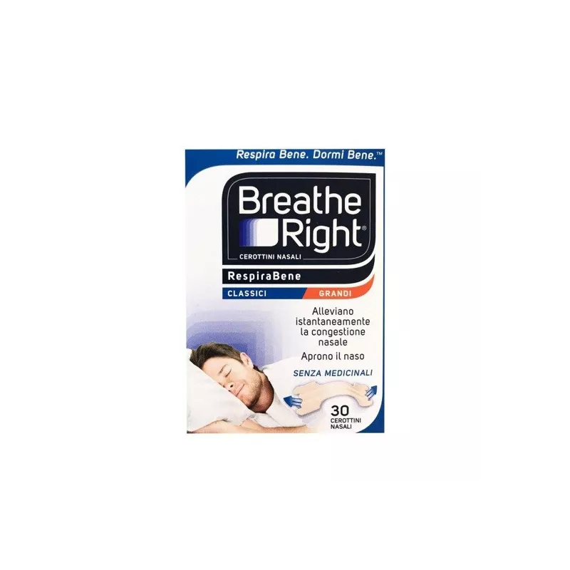 Breath Right RespiraBene è un dispositivo medico per adulti che aiuta a respirare meglio e a ridurre il russamento; i cerottini nasali Breath Right Respirabene allargano delicatamente i passaggi nasali, facilitando la respirazione in caso di congestione nasale, allergia o raffreddore.