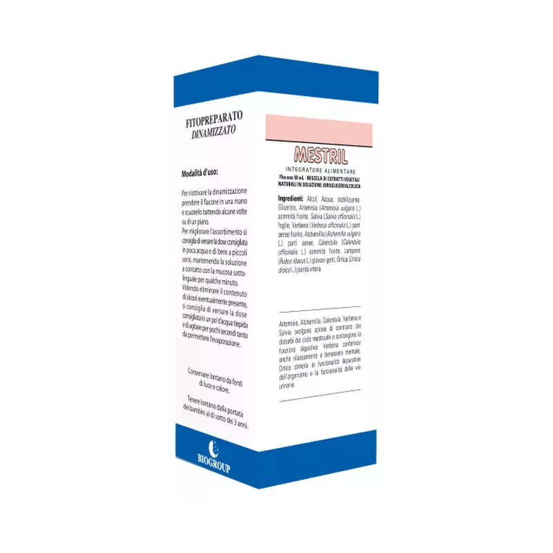 Ingredienti Alcol (53% vol.), acqua; stabilizzante: glicerolo; artemisia (Artemisia vulgaris L.) sommità fiorite, salvia (Salvia officinalis L.) foglie, verbena (Verbena officinalis L.) parti aeree fiorite, alchemilla (Alchemilla vulgaris L.) parti aeree, calendula (Calendula officinalis L.) sommità fiorite, lampone (Rubus idaeus L.) giovani getti, ortica (Urtica dioica L.) pianta intera.