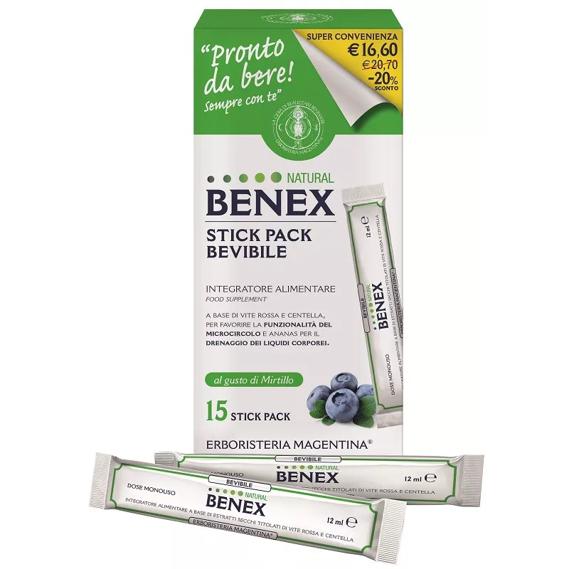 Ingredienti Succo di mela, acqua, succo di mirtillo, vite rossa (Vitis vinifera L.) semi estratto secco (titolato al 95% in procianidine), centella [Centella asiatica (L.) urb.] parti aeree estratto secco (titolato al 3% in derivati triterpenici totali), orthosiphon (Orthosiphon stamineus Benth.) foglie estratto secco (titolato allo 0,75% in acido rosmarinico), magnesio citrato, ananas [Ananas comosus (L.) merr.] gambo estratto secco (titolato al 0,3% in bromelina), mirtillo (Vaccinium myrtillus L.) bacche estratto secco (titolato all'1% in antocianidine), ippocastano (Aesculus hippocastanum L.) corteccia estratto secco (titolato al 4% in escina), bromelina (2.500 gdu/g); antiossidante: acido ascorbico; conservante: sorbato di potassio; acidificante: acido citrico.