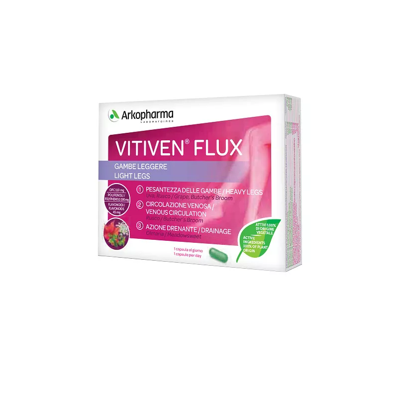 Descrizione Integratore alimentare a base di piante e di vitamina B2. Vitiven Flux contribuisce a migliorare il benessere della circolazione venosa (Rusco). L'uva e il rusco (o pungitopo) favoriscono la funzionalità del microcircolo dando sollievo in caso di gambe pesanti. L'uva ha un'azione antiossidante. L'olmaria favorisce il drenaggio dei liquidi corporei. La vitamina B2 contribuisce alla protezione delle cellule contro lo stress ossidativo.