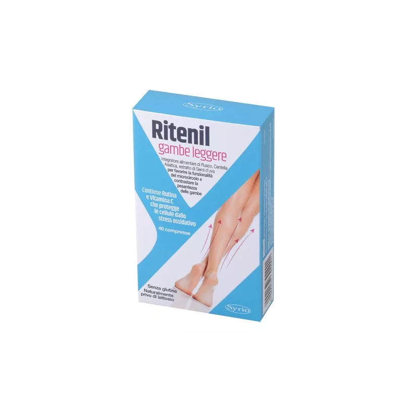 Descrizione Integratore alimentare di rusco, centella asiatica ed estratto di semi d'uva ricco in bioflavonoidi, per favorire la funzionalità del microcircolo e contrastare la pesantezza delle gambe. La centella asiatica aiuta a contrastare gli inestetismi della cellulite, mentre l'estratto di semi d'uva possiede proprietà antiossidanti e favorisce la regolare funzionalità dell'apparato cardiovascolare. Ritenil gambe leggere contiene inoltre il flavonoide rutina e la vitamina C che protegge le cellule dallo stress ossidativo e contribuisce alla normale formazione del collagene per la normale funzione dei vasi sanguigni.