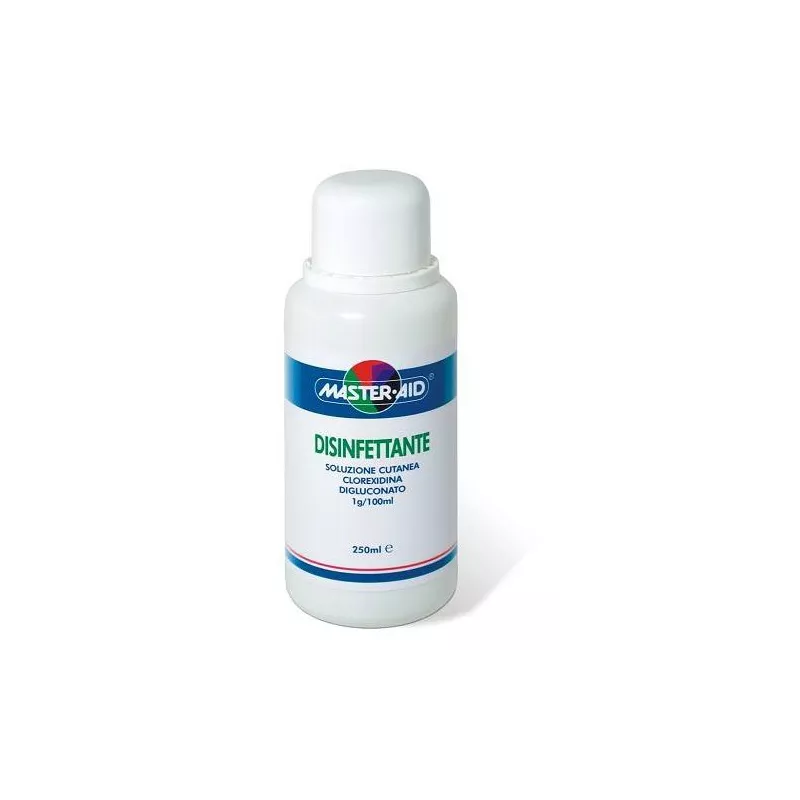 MASTER-AID Disinfettante contiene il principio attivo clorexidina digluconato che appartiene alla categoria delle biguanidi ed è un disinfettante per uso topico (locale) dermatologico (cutaneo).
