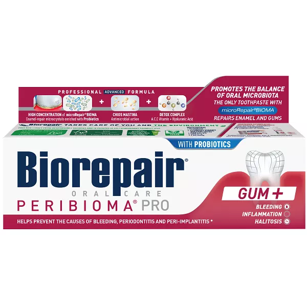 Mousse Biorepair PERIBIOMA PRO, dalla morbida e soffice consistenza, avvolge delicatamente le gengive donando sollievo e protezione duratura. La formula è a base di microRepair BIOMA, microcristalli ripara-smalto* arricchiti con specifici Probiotici selezionati che aiutano a riequilibrare il normale microbiota orale per proteggere dalle principali cause delle infiammazioni del cavo orale. Biorepair PERIBIOMA Mousse è potenziata con Mastica di Chios per un'azione antibatterica e antimicrobica. Le vitamine A, C, E e l’acido ialuronico arricchiscono la mousse con le loro proprietà antiossidanti e detox sui tessuti.