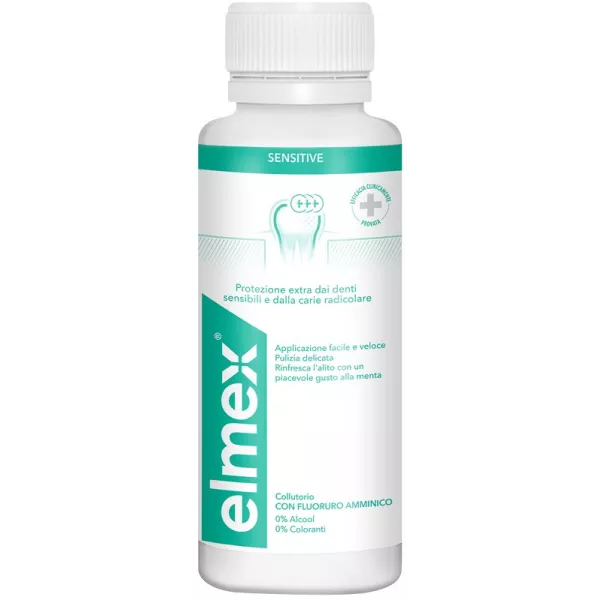 Protezione tre volte superiore rispetto all'utilizzo del solo dentifricio (l’utilizzo quotidiano del collutorio per almeno 3 mesi, in aggiunta al dentifricio elmex SENSITIVE, offre una protezione 3 volte superiore dalla carie radicolare intorno alla dentina rispetto all'utilizzo del solo dentifricio).
