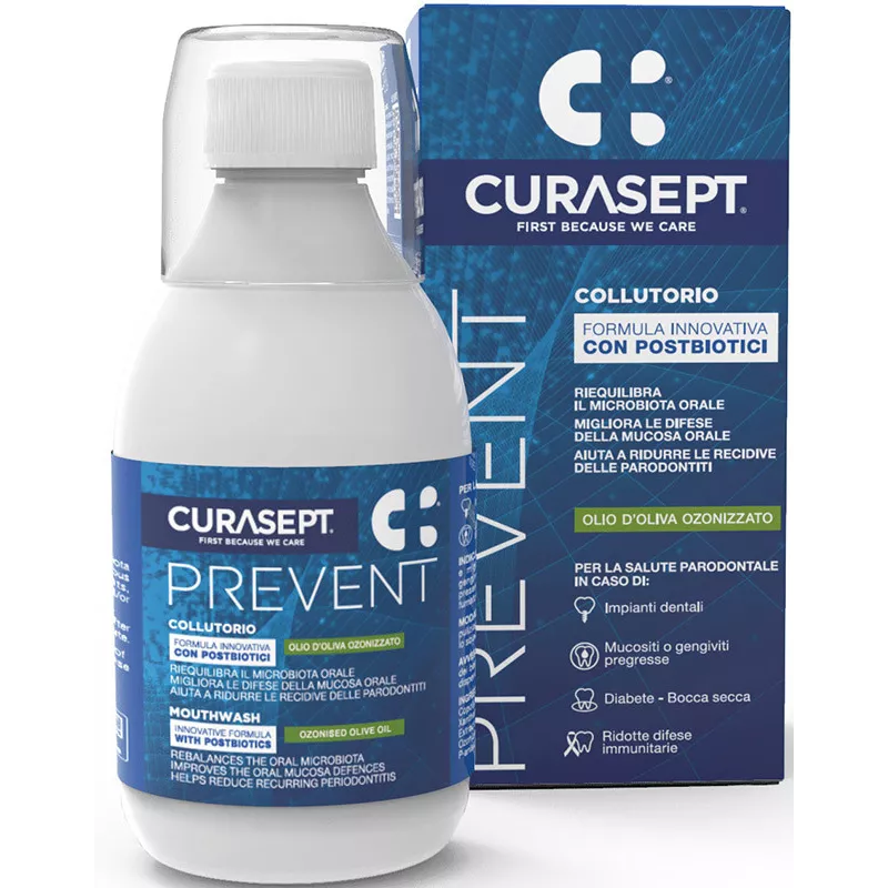 Curasept Prevent Collutorio ad uso quotidiano. Riequilibra il microbiota orale e migliora la salute del tessuto gengivale, anche in caso di patologie gengivali pregresse. Ideale per portatore di impianti, fumatori, diabetici, bocca secca, soggetti con difese immunitarie compromesse.