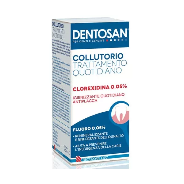 Collutorio con clorexidina 0,05%, che assicura una completa igiene orale inibendo lo sviluppo dei batteri che formano la placca, e fluoro 0,05%, che svolge un’azione protettiva, rinforzante e remineralizzante dello smalto aiutando a prevenire l’insorgenza della carie.