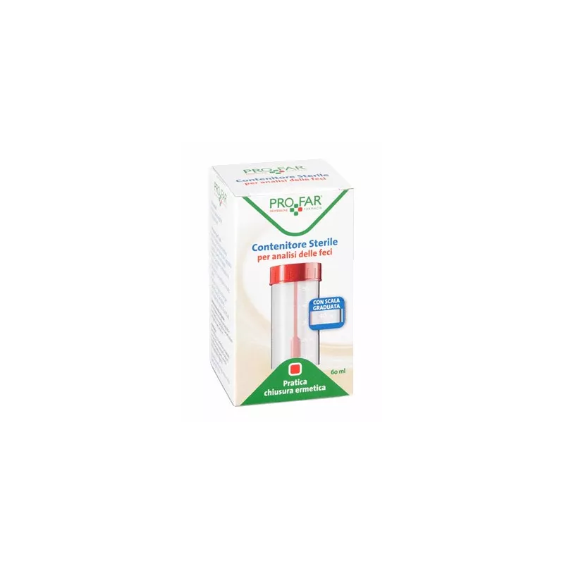 Contenitore sterile per analisi delle feci, in polipropilene con scala graduata, pratica chiusura ermetica, spatola raccogli campione, etichetta adesiva per l'annotazione dei dati identificativi e istruzioni dettagliate sulla modalità di conservazione del campione.