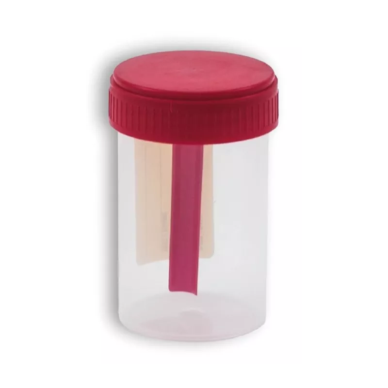 Contenitore per feci con tappo a vite rosso. Destinato esclusivamente alla raccolta e trasporto di campione biologico per effettuare le analisi di laboratorio, in caso di test delle feci.