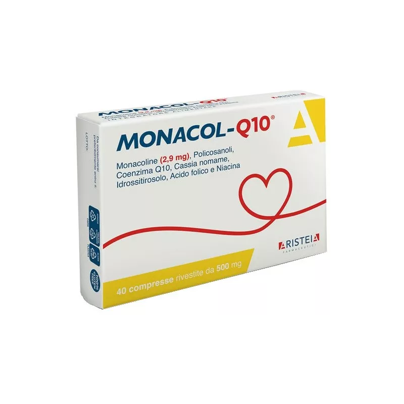 Ingredienti Agente di carica: cellulosa microcristallina; Cassia [Cassia mimosoides var. nomame (Siebold) Makino, folium] e.s. tit. 8% flavonoidi, policosanoli (da Oryza sativa L. fructus) e.s. tit. 60% octacosanolo, coenzima Q10, vitamina B3 (nicotinammide). Coadiuvante tecnologico: magnesio stearato. Antiaggregante: biossido di silicio. Idrossitirosolo (da Olea europaea L. fructus), monacoline (da estratto di riso rosso fermentato con Monascus purpureus titolato al 3% in monacoline), vitamina B6 (piridossina cloridrato), quatrefolic (acido 5-metiltetraidrofolico, sale di glucosammina), vitamina B12 (cianocobalamina); agenti di rivestimento: idrossipropilmetilcellulosa E464, calcio carbonato E170, polietilenglicole 4.000 E1521, talco E553b, riboflavina E101, giallo di chinolina E104.