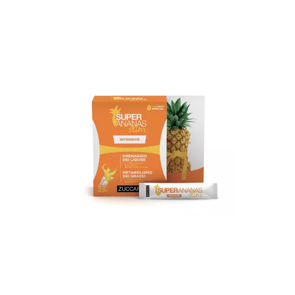 SUPER ANANAS slim INTENSIVE Favorisce il metabolismo dei grassi grazie agli estratti di matè, garcinia cambogia e arancio amaro, il quale agisce come stimolo metabolico per l'equilibrio del peso corporeo.