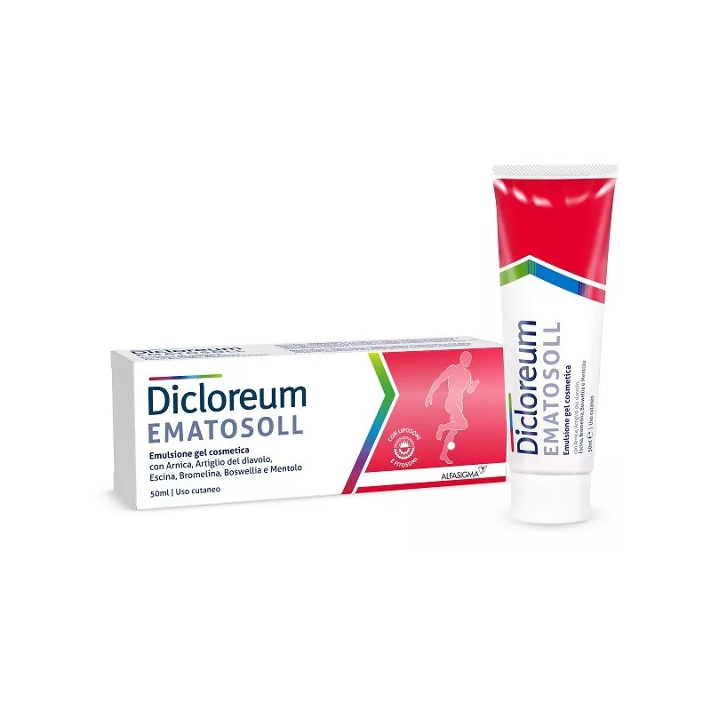 Gel cosmetico con arnica, artiglio del diavolo, escina, bromelina, Boswellia e mentolo, studiato per favorire il benessere della pelle. In particolare, svolge un'azione lenitiva e agisce per mantenere le normali condizioni cutanee in caso di contrasti imprevisti che possono capitare durante le attività della vita quotidiana o sportiva. Dona un'immediata e prolungata sensazione di freschezza. Dicloreum Ematosoll gel è una formulazione innovativa in quanto alcune delle sostanze funzionali sono formulate in liposomi (bromelina) e fitosomi (escina e boswellia), che ne favoriscono l'efficacia e la permanenza a livello cutaneo. Si assorbe rapidamente, senza ungere.