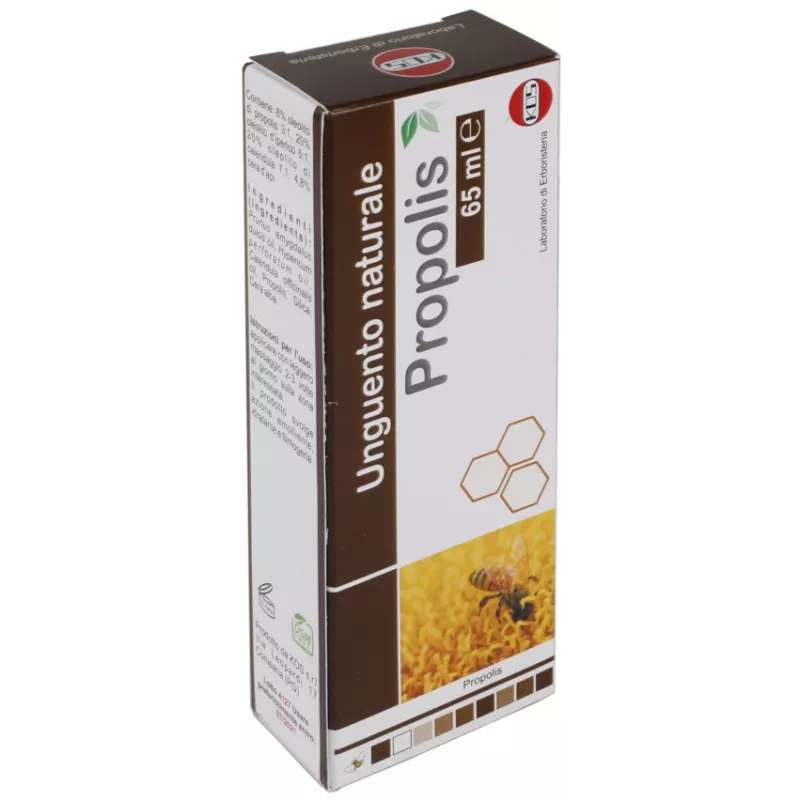 Unguento naturale contenente l'8% di oleolito di propolis 3:1, 20% oleolito d'iperico 5:1, 20% oleolito di calendula 7:1, 4,8% cera d'api. Durante la primavera e l'estate, nelle ore più calde della giornata, le api bottinatrici raccolgono e in parte metabolizzano diverse resine trasformandole in propolis. Successivamente impiegano questo elaborato per richiudere le fenditure dell'alveare e proteggerlo dalle aggressioni di insetti e batteri. Il colore della propolis può variare dal giallo bruno scuro, l'odore è caratteristico, con la prevalenza di note vanigliate o di gemme di betulla e pioppo. OGM free.