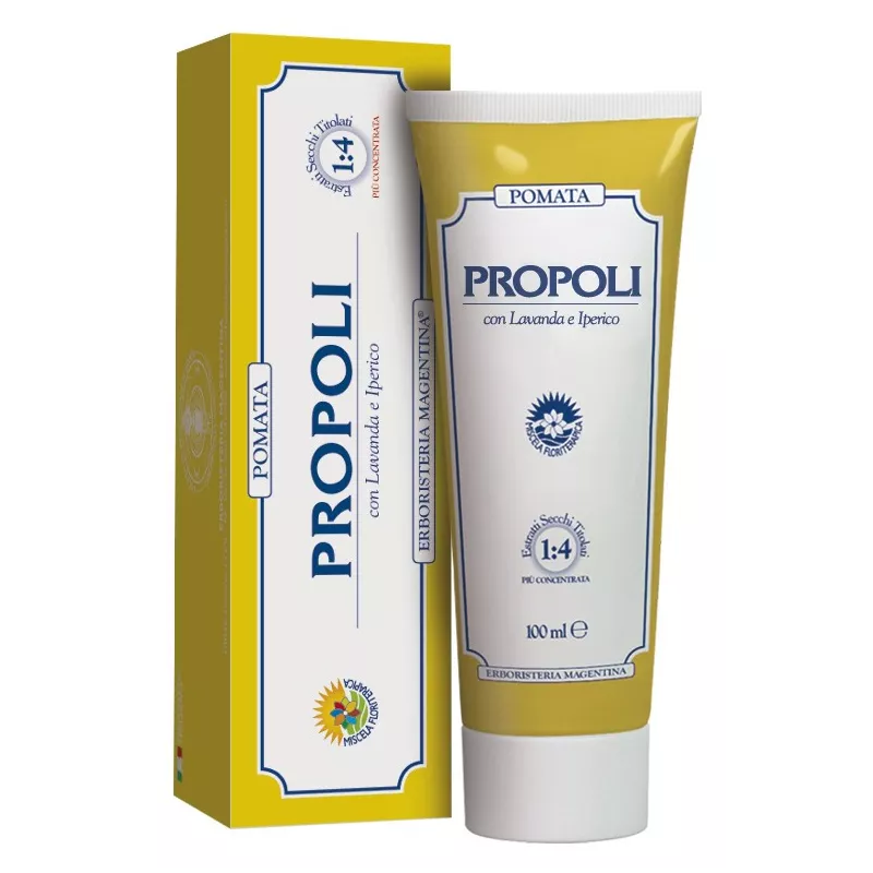 Aloe Barbadensis gel, Propoli estratto in polvere, oli di Mandorle Dolci e Rosa Mosqueta, Burro di Karité, estratto glicerigo di Lichene Islandico, estratto acquoso (D/E 4:1) di Centella, estratto liposolubile di Iperico, acqua aromatica di Hamamelis, Pantenolo, Vitamina E, olio essenziale di Lavanda; miscela floriterapica: Willow, Crab Apple, Holly e Star of Bethlehem.